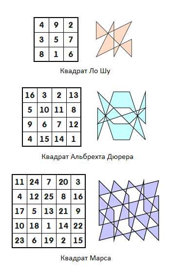 Так как квадраты бывают разного порядка и чем выше порядок, тем больше вариантов размещения в них чисел, то каждому такому квадрату будет соответствовать свой уникальный узор.