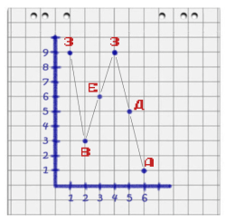 Итак, у меня была табличка с шестью дискретными значениями - порядковыми номерами букв в слове и в алфавите. Для начала я просто попробовал отобразить их на графике в виде точек.