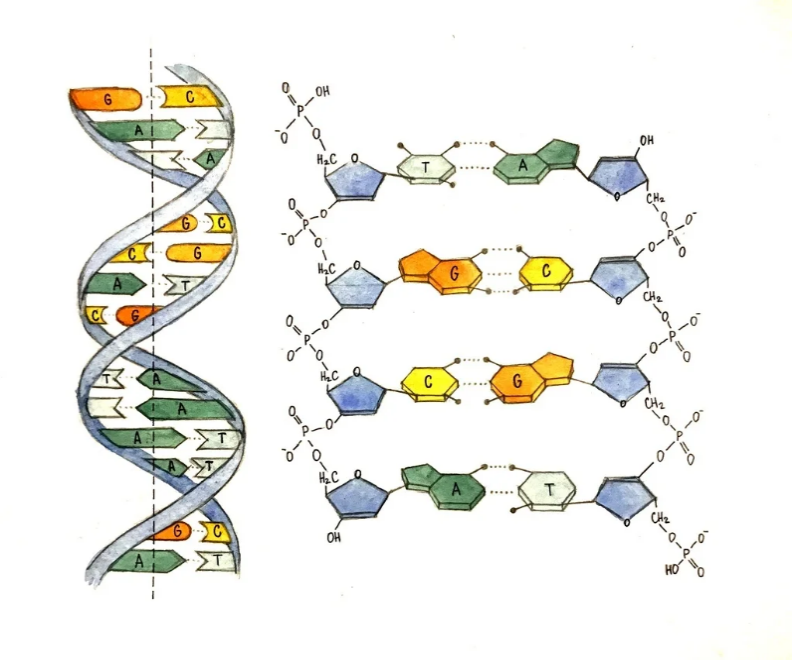 Наибольшая третья часть сообщения, выделенная зелёным, описывает строительные блоки ДНК. Дезоксирибозы и фосфаты по сторонам образуют «каркас» ДНК, внутри которого находятся две пары азотистых оснований: аденин — тимин и гуанин — цитозин.