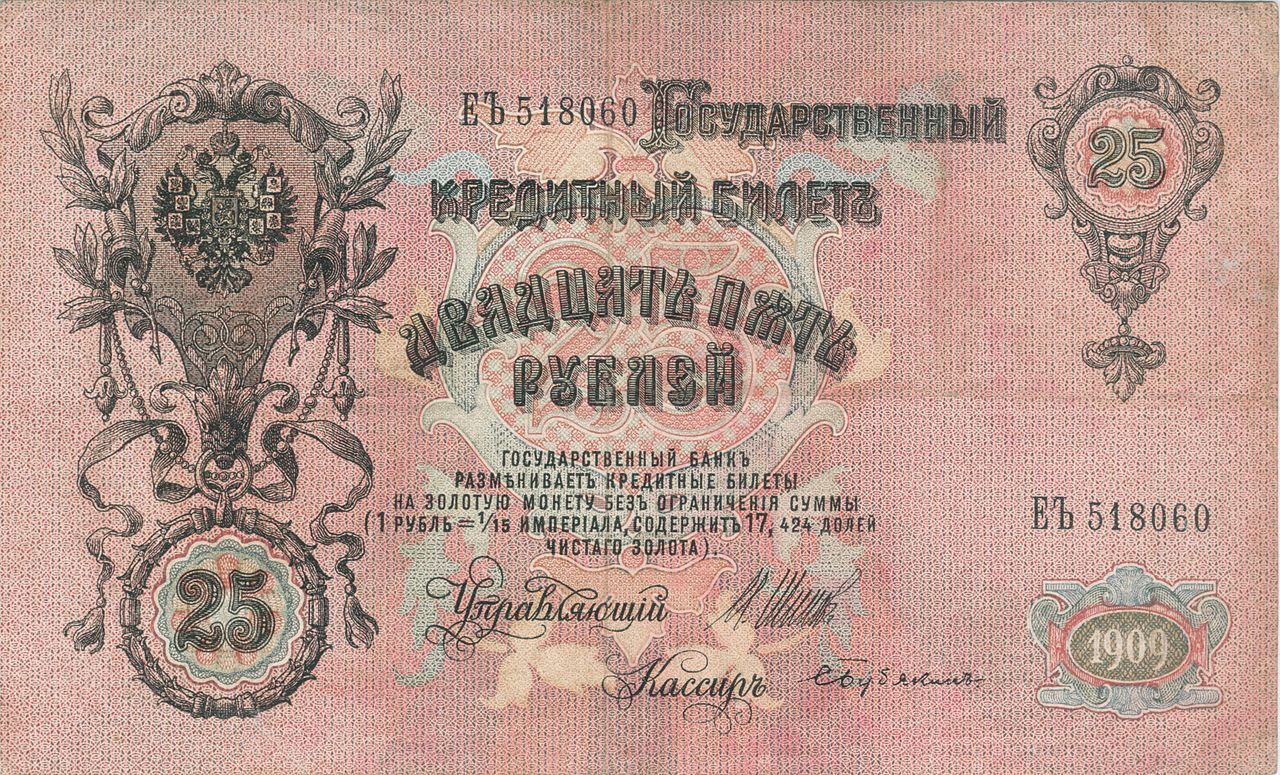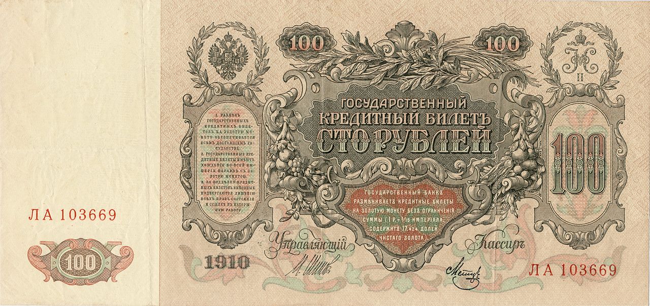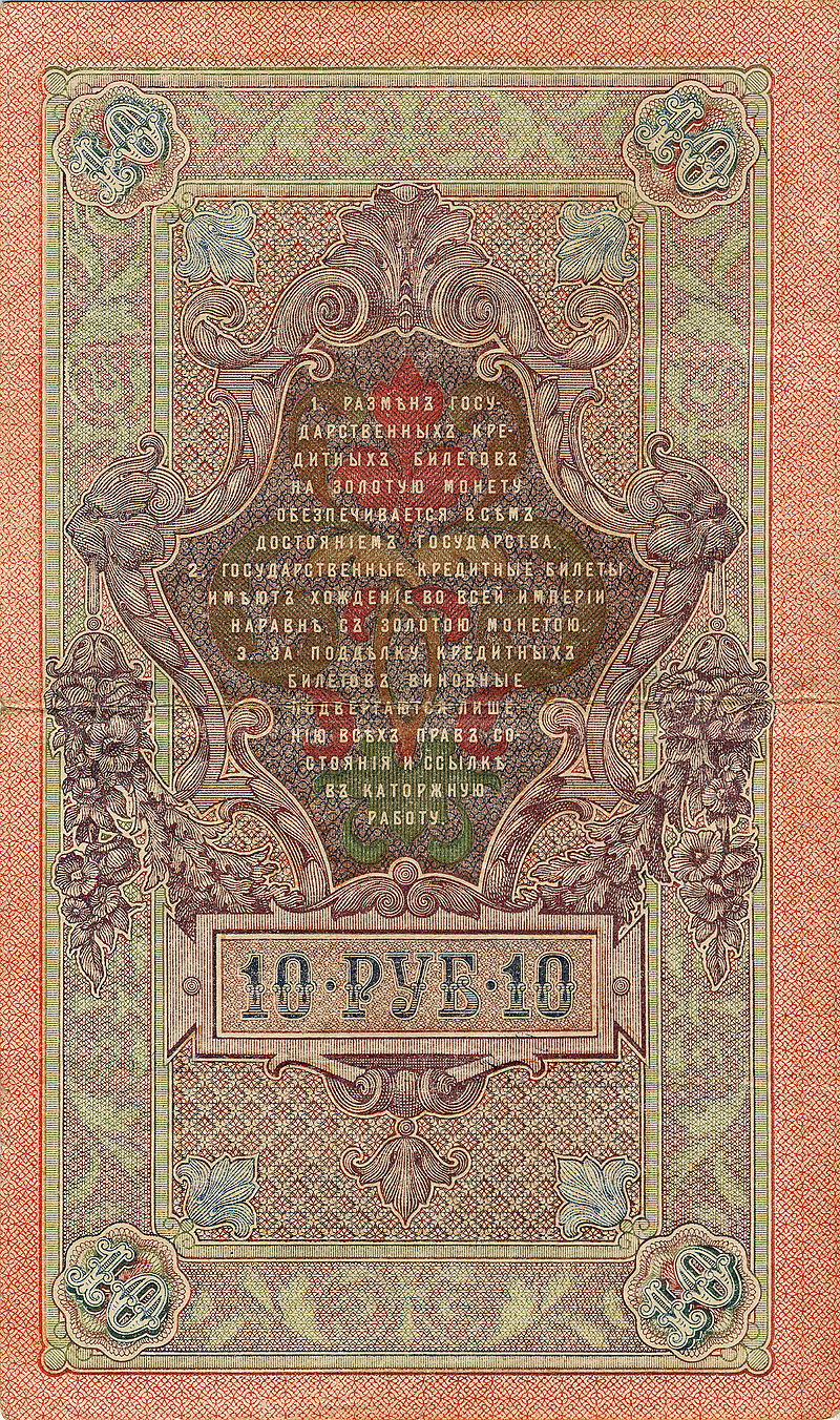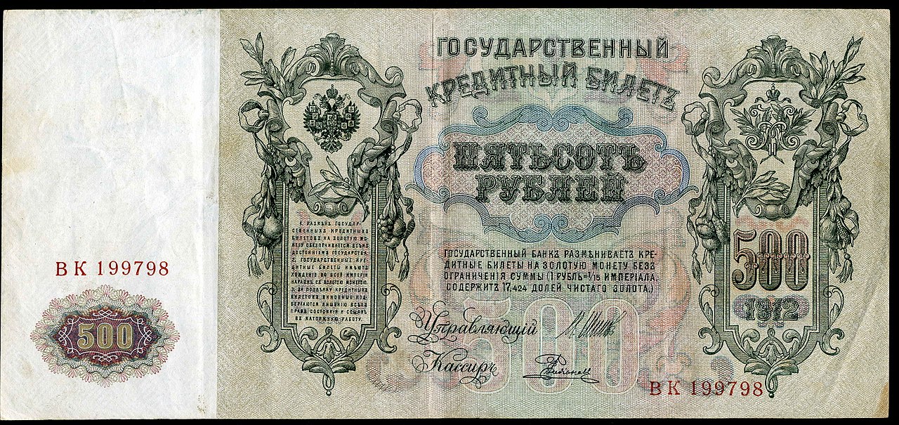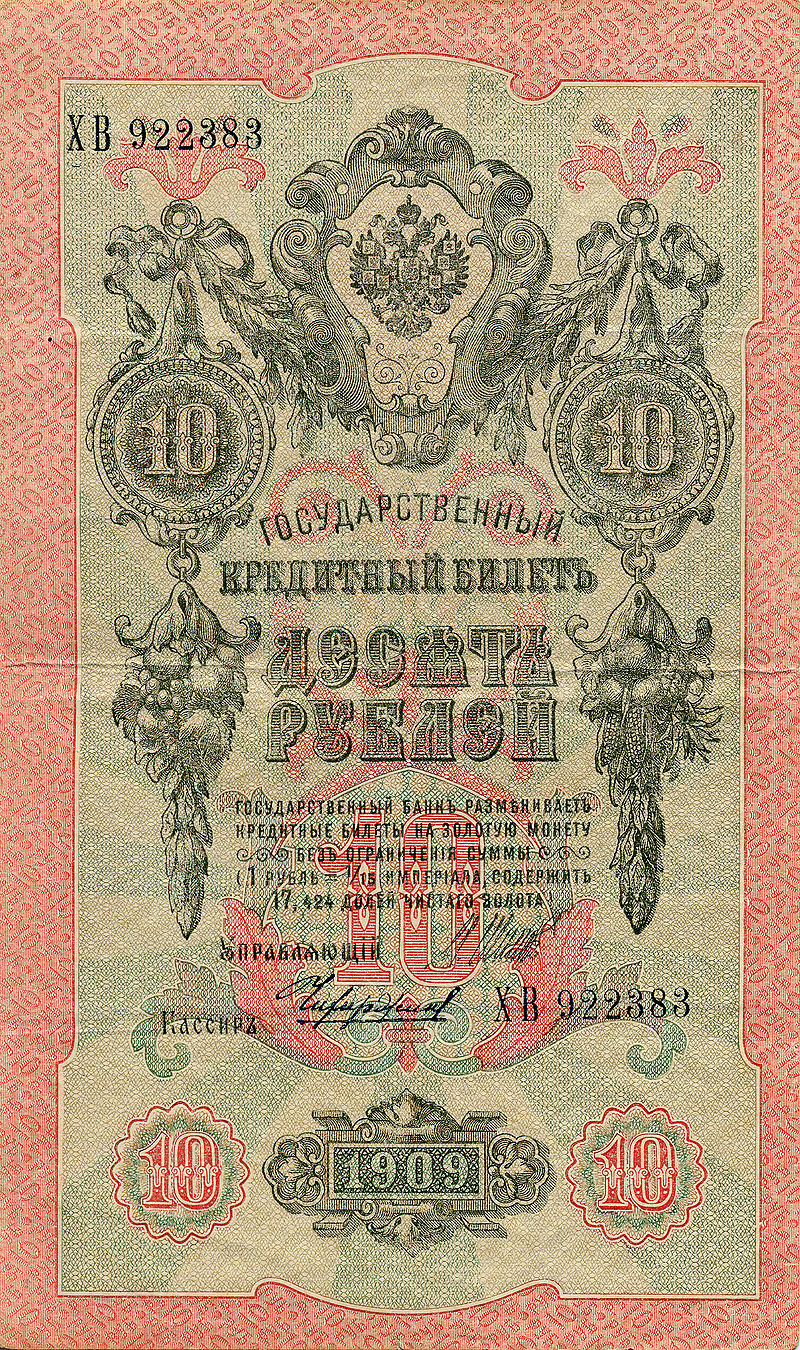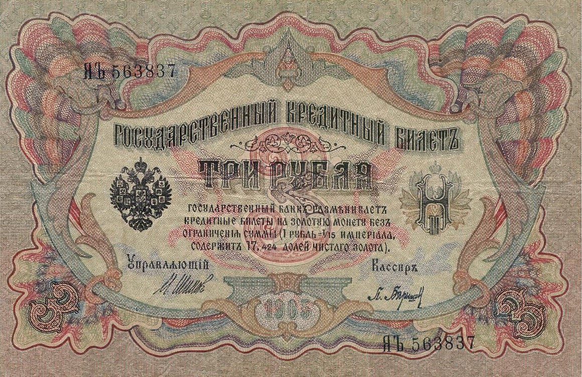 Первая русская революция 1905−1907 годов стала для Российской империи большим потрясением, но экономика страны удержалась от инфляции и падения (не без помощи займа в 843 млн рублей у Франции). К этому времени в ходу были появившиеся в результате денежной реформы 1895—1897 гг. государственные кредитные билеты образца 1898—1899 годов с номиналами в 1, 3, 5, 10, 100 и 500 рублей.