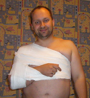 Прикиньте, впервые в жизни так навернулся с лестницы, что в результате вывих, перелом плечевой кости, растяжение и ушиб одновременно ;) Не считая, что пузо поцарапал и ногу. Короче, гипс.