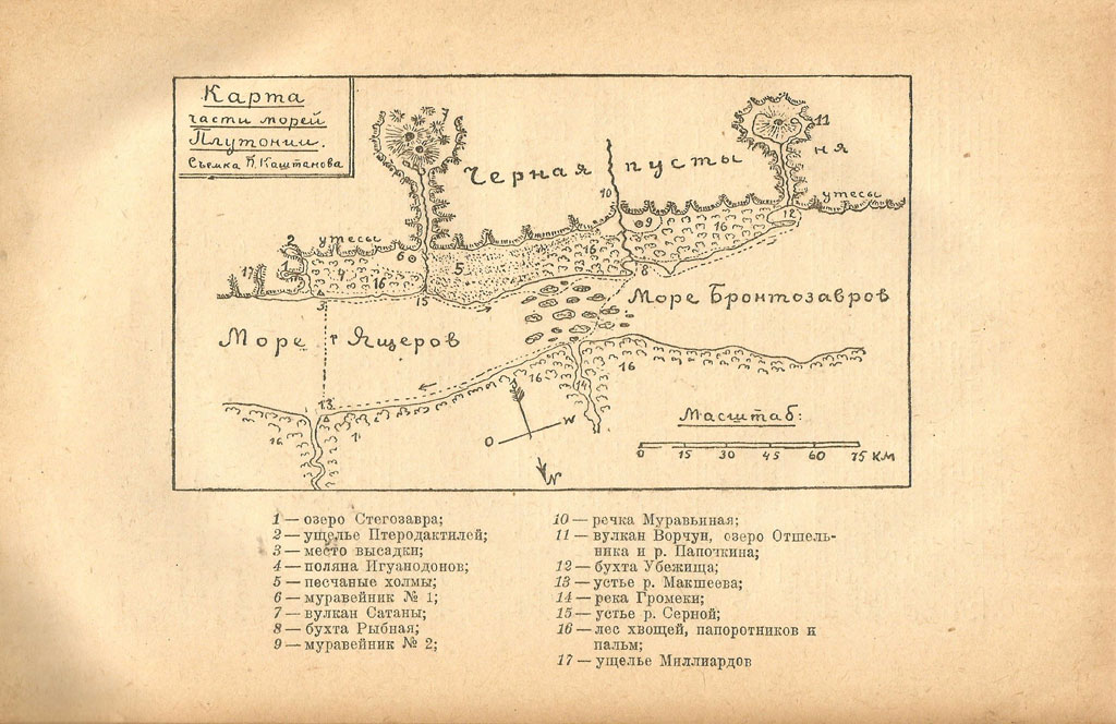 В общем, экспедиция отправляется в неизученную область в Северном ледовитом океане, находит остров, в нём разлом, и, спускаясь вниз, попадает на внутреннюю поверхность Земли. А там доисторические времена: мамонты, птеродактили, саблезубые тигры и т.п. Раньше там этого ничего не было, т.к. не было дырок, соединяющих наружную и внутреннюю поверхности Земли. Но вот в давние времена, когда жизнь только зародилась, и господствовали динозавры, в Землю врезался огромный метеорит, который пробил оболочку. Через образовавшуюся дыру часть океана попала на внутреннюю поверхность (в Плутонию).