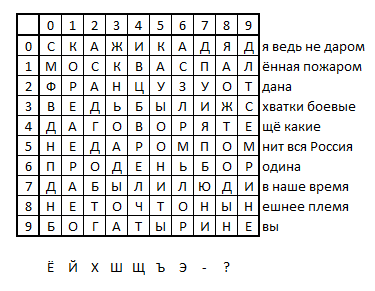 Этот метод шифрования похож на шифр Полибия, только в качестве ключа используется не алфавит, а стихотворение, которое вписывается построчно в квадрат заданного размера (например, 10×10). Если строка не входит, то её «хвост» обрезается или переносится на другую строку. Далее полученный квадрат используется для кодирования текста побуквенно двумя координатами, как в квадрате Полибия. Например, берём хороший стих «Бородино» Лермонтова и заполняем таблицу. Замечаем, что букв Ё, Й, Х, Ш, Щ, Ъ, Э в таблице нет, а значит и зашифровать их мы не сможем. Буквы, конечно, редкие и могут не понадобиться. Но если они всё же будут нужны, придётся выбирать другой стих, в котором есть все буквы.