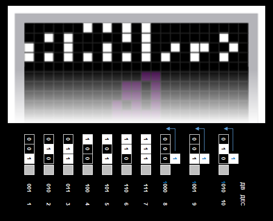 Числа от 1 до 7 представлены тройками квадратов, где каждая тройка занимает один столбец. Числа от 8 до 10 не помещаются в одну тройку (один столбец), потому что в двоичной системе они имеют 4 разряда; в этом случае старшие разряды смещаются вправо. Чтобы восстановить число, надо выстроить всё в одну цепочку – сначала младшие «помеченные» разряды, затем спереди к ним приписывать разряды, которые старше (правее).