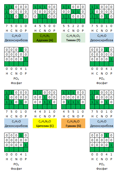 Наибольшая третья часть сообщения, выделенная зелёным, описывает строительные блоки ДНК. Дезоксирибозы и фосфаты по сторонам образуют «каркас» ДНК, внутри которого находятся две пары азотистых оснований: аденин — тимин и гуанин — цитозин.