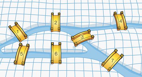 Вот пример классической задачи из теории графов. Это старинная математическая задача, в которой спрашивалось, как можно пройти по всем семи мостам Кёнигсберга, не проходя ни по одному из них дважды. Мосты располагались вот так.