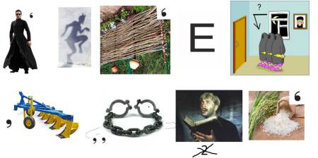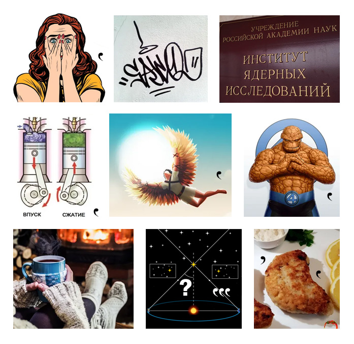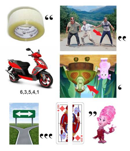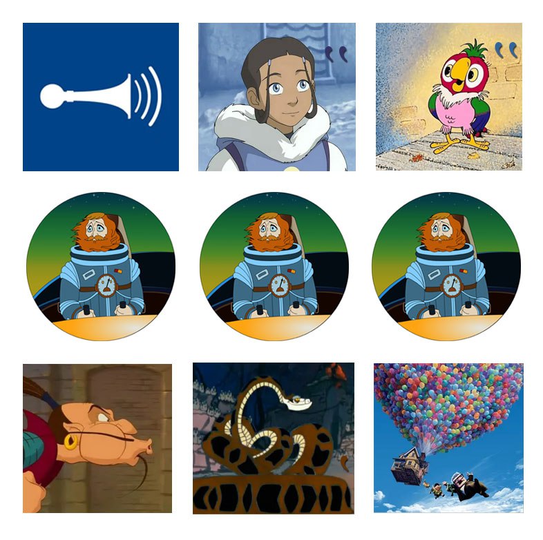 - В ребусе использованы персонажи и кадры из мультфильмов: Катара из мультсериала «Аватар: Легенда об Аанге», попугай Кеша из советского м/ф «Возвращение блудного попугая», Капитан Зелёный из легендарного советского мультика «Тайна Третьей планеты», свистящий Соловей-разбойник из российского мультфильма «Три богатыря. Илья Муромец и Соловей Разбойник», питон Каа из советской версии «Маугли», кадр из американского мультфильма «Вверх».