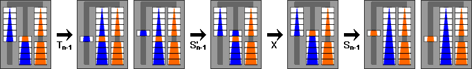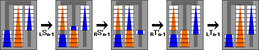 Here the inverse of a move or move sequence is denoted by a tick mark. Also new is the move sequence denoted by X, which consists of 4 moves and swaps the top two disks on the middle peg. Note how Tn is just like Sn but without the unnecessary X swap.