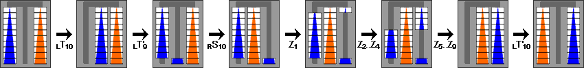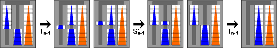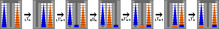 It turns out that there are some small move cancellations here or there in S and T, but even optimally T10 needs 4875 moves so this is a rather good method for it. On the other hand, there is a much better way of exchanging the towers than doing the pairs at each level from the bottom up, because we can do much of the work on the top pieces during the exchange of the bottom pair. This is easiest to explain using the following sequence of moves, which we will call Zn:
